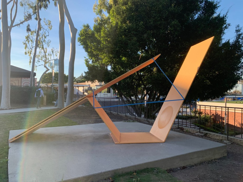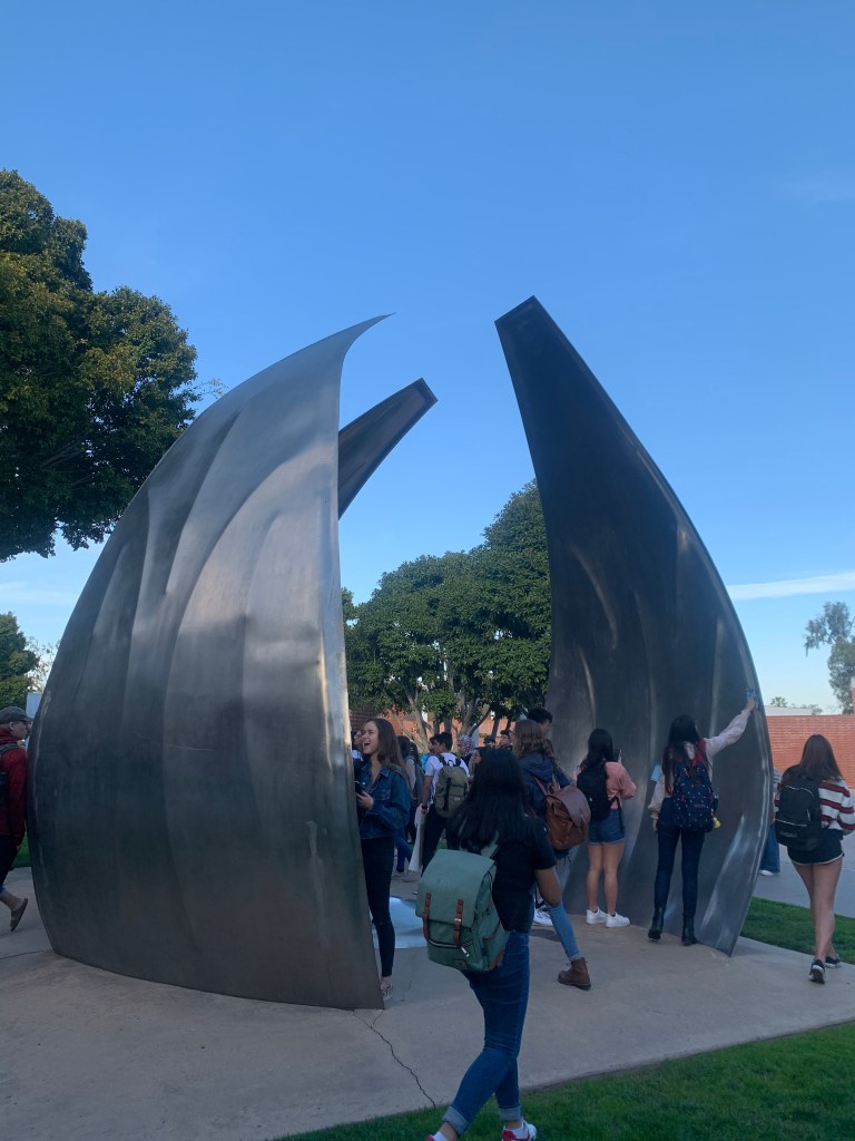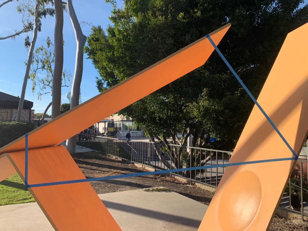 1&2. For my finding art activity, we decided to create an abstract frame from a previous art piece located on upper campus. The form of the object are long flat metal sheets that are smooth to the touch and yellow in color. We decided to work with the complex shape because we wanted to see if a frame would abstract the object more. The contrast between the yellow and blue masking tape are apparent enough for it to be considered part of the art piece. Looking specifically inside the frame, the subject is minimal and to some may be considered nothing. I personally find interest in viewing the shapes that the yellow boarders create. we used one of the yellow sheets to complete the frame image. The tape lines are sharp to keep the same thinness and flat aesthetic of the original art.Looking at our frame from close and afar generate two different experiences. Looking closely, our frame centers around a space of air which leads to a tree. Looking forward can lead to a bland subject if nothing is presented but I enjoy looking at the frame or shapes that protrude from the frame created. Looking at them, a spiral of sharp lines and interesting geometric shapes are seen. Walking to our frame from a distance, the frame can be seen in multiple sections including a top and bottom frame. It allows for the viewer to choose which portion of the object they enjoy most. Overall as an art piece, one grand scale object can amaze an audience, but it is also important to view the architecture or design of an object up close. In doing so the viewer can gain an appreciation for looking at the subject for in depth.